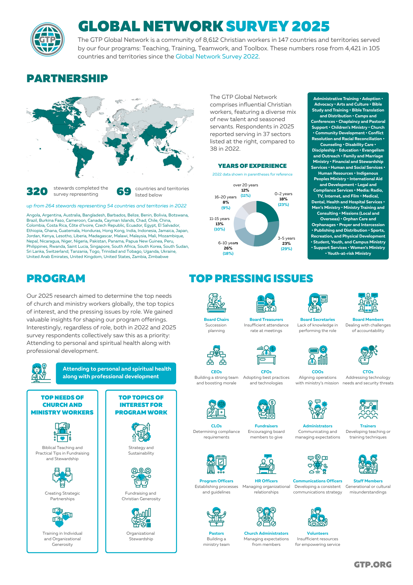 In September 2025, we surveyed the GTP global network to gain data to strengthen our partnership and program efforts in the months to come. 320 Christian workers completed the survey, representing 69 countries and 37 sectors. We assessed the findings and summarized the survey results through this infographic.