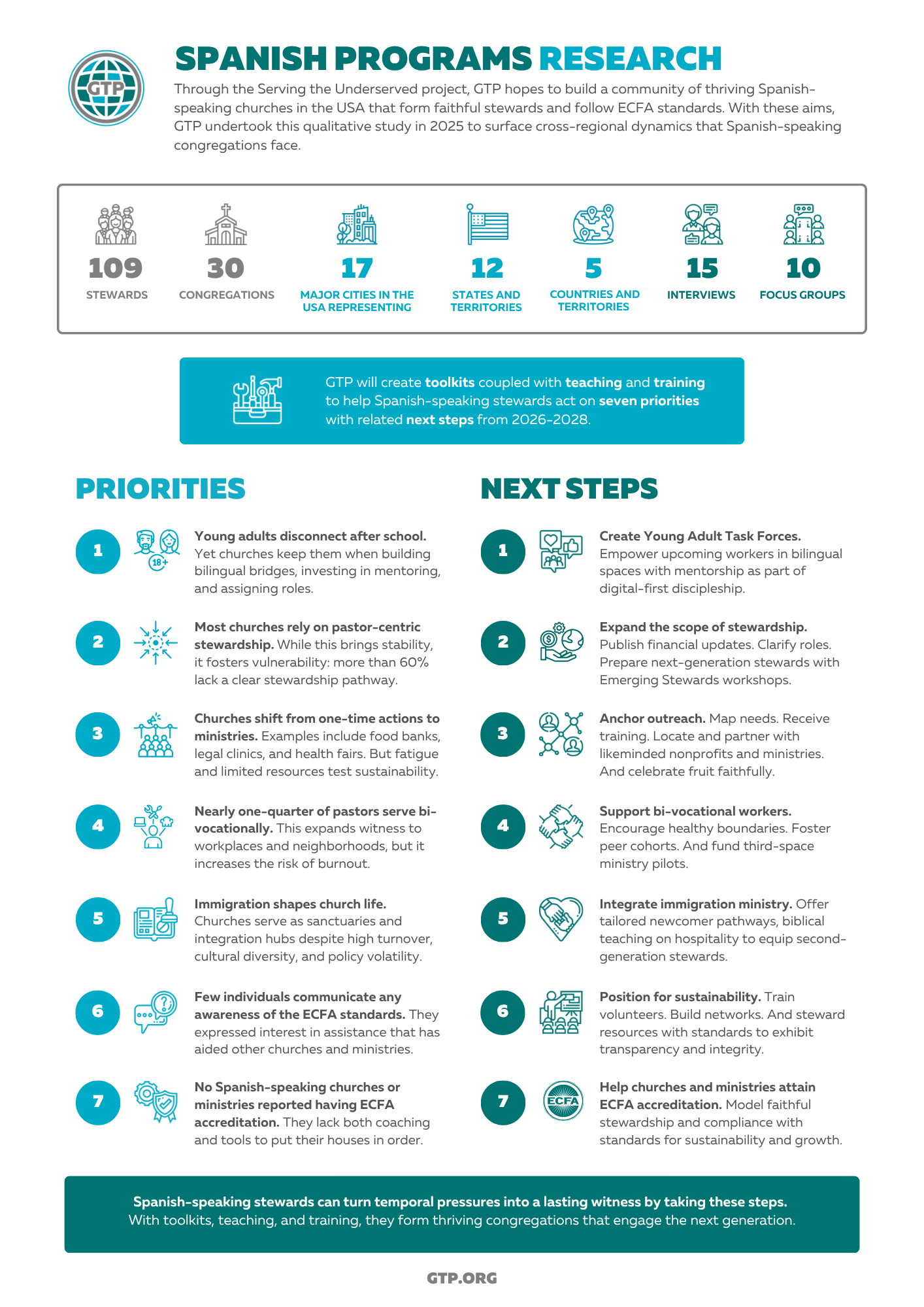 Through the Serving the Underserved project, GTP hopes to build a community of thriving Spanish-speaking churches in the USA that form faithful stewards and follow ECFA standards. With these aims, GTP undertook this qualitative study in 2025 to surface cross-regional dynamics that Spanish-speaking congregations face. We summarized the research findings through this infographic.